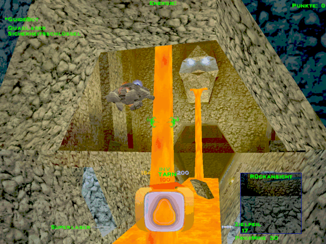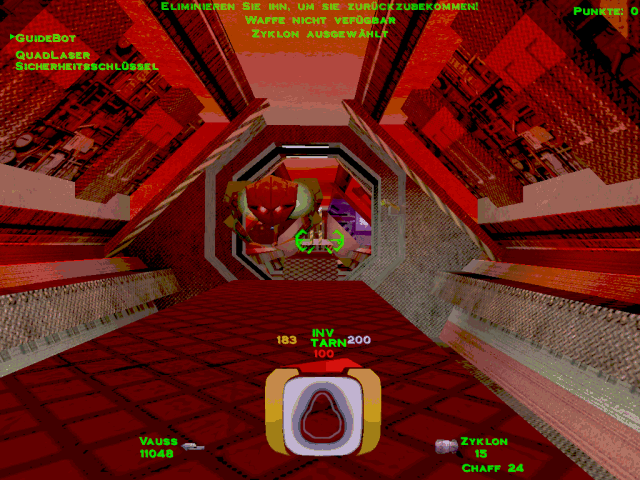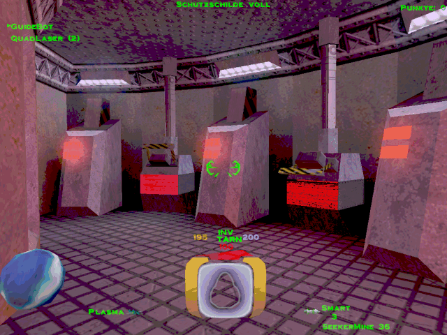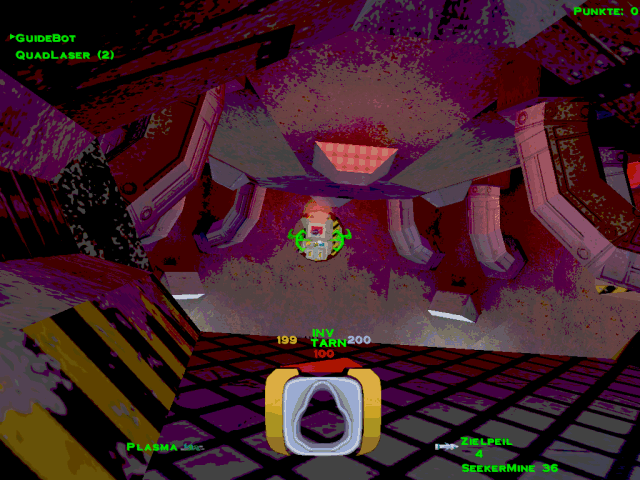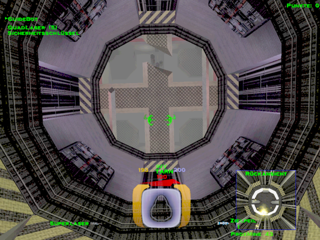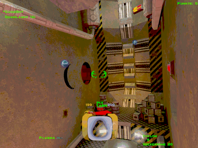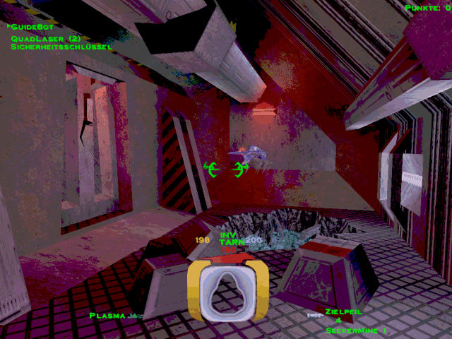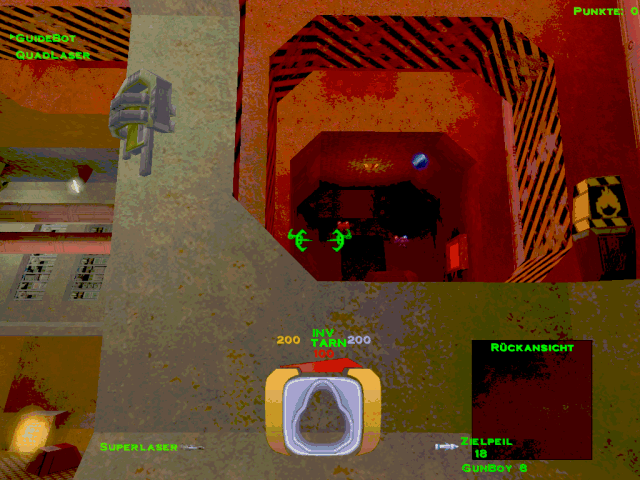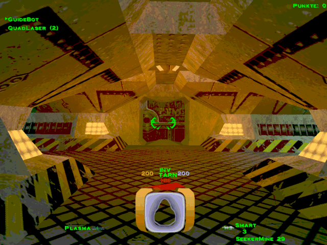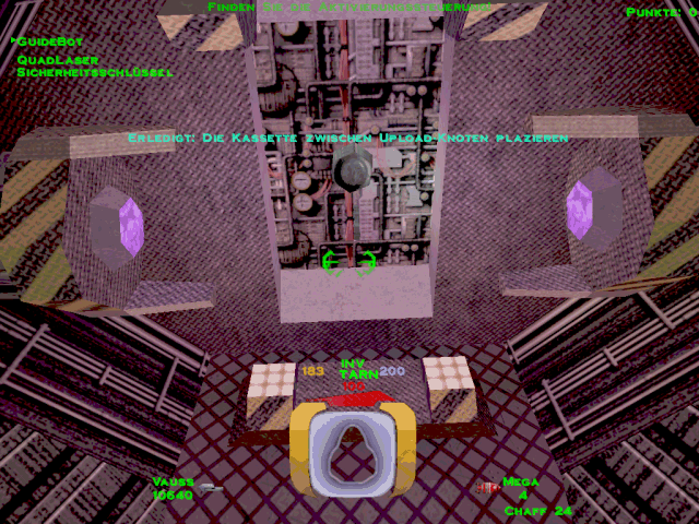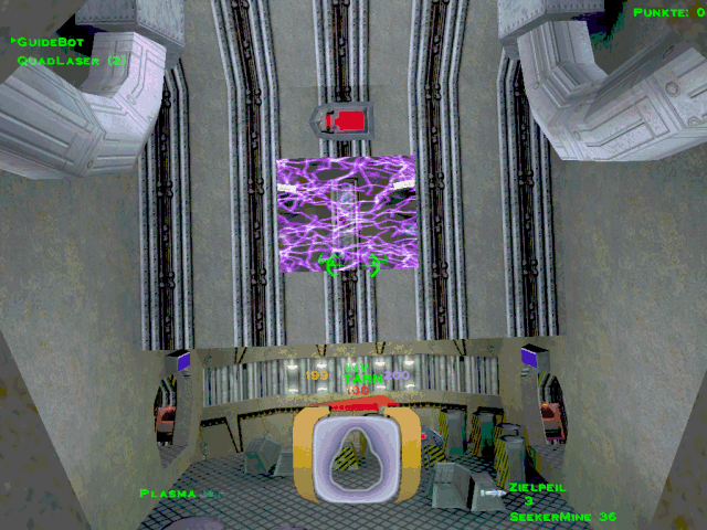 ![]() [ nach oben ] Das erste Level mit mehr als nur einer Seite Informationen. ![]() [ nach oben ] Zu Beginn arbeitet man sich hinter dem Guidebot vorwärts bis zu diesem Raum mit den drei Monitoren vor dem ein Tubbs freundlich auf Dich wartet. Rechts und Links unter den Laufstegen sind Geschütze und unter den Monitoren ist ein Schalter, mit dem man das Kraftfeld zur linken Seite deaktivieren kann. Bis auf ein paar Waffen und einige Gegner, gibt es dort jedoch nichts zu erledigen. Der Weg führt dich weiter nach rechts... ![]() [ nach oben ] ...in einen Raum mit einem Geschütz an der Decke. Unter dem Teil stehen Kisten mit Schrapnell und die explodieren sofort wenn sie getroffen werden. Rechter Hand - diese Ansicht - versperrt ein Kraftfeld den Weg zur Oberfläche. Geradeaus geht eine Tür zum Kraftfeldschalter durch ein Energiezentrum. Natürlich bewacht. ![]() [ nach oben ] Hat man das Kraftfeld abgeschalten, sollte man sich vorsichtig dem Außenbereich nähern. Blitze schlagen in den Türmen ein und jeder dritte Blitz wird in deine Richtung entladen. Ein unzerstörbarer Hauptturm, der alle selbstlenkenden Raketen anzieht, wird von vier Masten umschlossen, die jeweils an der unteren schmalen Stelle (Fadenkreuz) angreifbar sind. Hat man alle vier Türme erledigt, muss man nur noch warten bis der Hauptturm explodiert und das im Hintergrund sichtbare Kraftfeld deaktiviert. Auf dem Weg zum nächsten Tunnel kann man sich die Zeit mit den Kugeln vertreiben, die sich problemlos herumballern lassen. ![]() [ nach oben ] Im Zugangstunnel unter der Decke ist wieder ein Geschütz und danach geht es steil abwärts. Unten angekommen ist 90° rechts der Tür ein Geheimraum mit Powerups. ![]() [ nach oben ] Im nachfolgenden Gang wartet am Ende ein Tubbs, aber als erstes sollte man hier links abbiegen und ein Nebenziel erledigen. ![]() [ nach oben ] Ein flacher Tunnel führt zum Datenraum (Tür rechts), der jedoch noch verschlossen ist. Geradezu ist ein Geheimraum und links geht es weiter zu einem Kraftfeld vor der Waffenkammer. ![]() [ nach oben ] Die hier sichtbare Waffenkammer hat ein Kraftfeld, aber das wird nur im Datenraum deaktiviert. Also biegt man hier wieder links ab. ![]() [ nach oben ] Am Ende des Ganges gibt es rechts und links je eine Kammer mit einem Schalter. Einfach beide Schalter betätigen. Beim Betätigen des zweiten Schalters taucht unten links die geöffnete Tür zum Datenraum auf. ![]() [ nach oben ] Leider wurde mit dem Datenlink auch das Matcen am Boden vor dem Datenraum aktiviert und man hat kaum die Zeit sich auf die Schalter im Datenraum zu konzentrieren. Denn auf der linken Seite muss der linke Schalter oben und der rechte nach unten zeigen. ![]() [ nach oben ] Auf der rechten Seite müssen beide Schalter nach oben zeigen. Sobald man das geschafft hat und noch lebt, kann man die Flucht zur Waffenkammer antreten und sich neue Munition besorgen. ![]() [ nach oben ] Dabei den Guidebot ausklinken, damit auch er sich den Powerup holen kann. Danach geht es wieder zurück zum Hauptgang an dessen Ende der Tubbs gewartet hat. Durch die Tür und den Gang entlang. ![]() [ nach oben ] Bis man zu dieser Kreuzung kommt. Die Tür geradeaus ist verschlossen und links um die Ecke ist ein Energiezentrum. Es geht also erst einmal nur nach rechts weiter. ![]() [ nach oben ] In diesem großen Raum ist in der linken Wand eine Geheimtür und unten ein Gang zu einem Energiezentrum mit ein paar gefährlichen Kisten. Das kann man auch auf dem Rückweg erledigen. Zuerst geht es hier rechts durch die Tür. ![]() [ nach oben ] Durch den Gang bis zu einem sehr großen Raum. Dort warten ungewöhnlich aufdringliche Brandhelfer. Falls man nicht die Nerven oder die Schilde verliert, kann man sich durch eine Geheimtür (hier direkt über dem rechten Teil des Fadenkreuz) mit einer Tarnung ausrüsten, die einem beim Klau des Datenschlüssel und der darauf folgenden Flucht sehr dienlich ist. ![]() [ nach oben ] Mit dem Schlüssel kann man nun die Tür öffnen und sich den Weg in den Untergrund bahnen. ![]() [ nach oben ] Der Guidebot sieht den Gang hier rechts nicht und fliegt zielstrebig daran vorbei. Dort gibt es zwar nur ein paar Powerups und einen sehr dunklen Tunnel, aber ein Besuch lohnt sich trotzdem. Etwas im Hintergrund sieht man helle Felsblöcke im Gang, die man unbedingt zerstören sollte. ![]() [ nach oben ] Denn hinter diesen Felsblöcken, hier rechts, ist ein Geheimraum mit nützlichen Sachen. Natürlich auch für den Guidebot. ![]() [ nach oben ] Am Ende des immer dunkler werdenden Tunnels versperren weitere Felsblöcke den Ausgang zur Oberfläche. Wegballern und durch geschlüpft. Draußen regnet es nicht nur, sondern es hagelt auch gelenkte Raketen und kleine Panzer machen Zielübungen. Also niemals stehen bleiben und nicht zu hoch fliegen. ![]() [ nach oben ] Durch ein kleines Tal geht es durch einen Mund in diese Lavahöhle. Man kann zwar ganz fix durch fliegen, aber dann entgehen einem nicht nur nützliche Powerups, sondern auch beschauliche Architektur. Rechts und links in den Wänden der Höhle gibt es Gänge mit Räumen am Ende. Nicht ganz ungefährlich, aber sehenswert. ![]() [ nach oben ] Besonders der Raum mit dem Zugangstunnel rechts unten bietet beeindruckende Skulpturen und drei weitere Gänge mit Powerups. ![]() [ nach oben ] Nach dem Bestaunen der Räume und einsammeln der Powerup geht es weiter durch die Lavahöhle und auf der anderen Seite wieder nach oben an die Oberfläche. Hier gibt es wieder Panzer und ein Stinger feuert gelenkte Raketen auf Dich. Entweder noch etwas im Höhlenausgang verstecken oder wagemutig an die frische Luft zum Laborgebäude im Hintergrund. ![]() [ nach oben ] Im Dachbereich sind Glasscheiben, die sich nur mit ballistischer Munition zerstören lassen. Blick man nun in den Hauptschacht nach unten, sieht man diesen Anblick. Jeder Steg führt zu einer Tür, jedoch ist nur die Tür auf 12 Uhr wichtig, denn diese Tür führt zur Datenkassette. Die Tür 