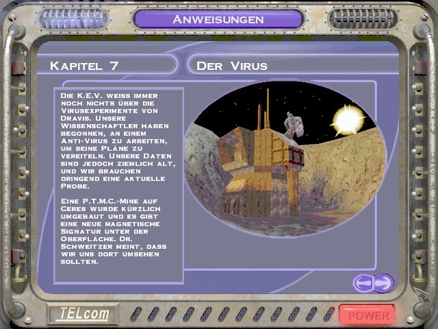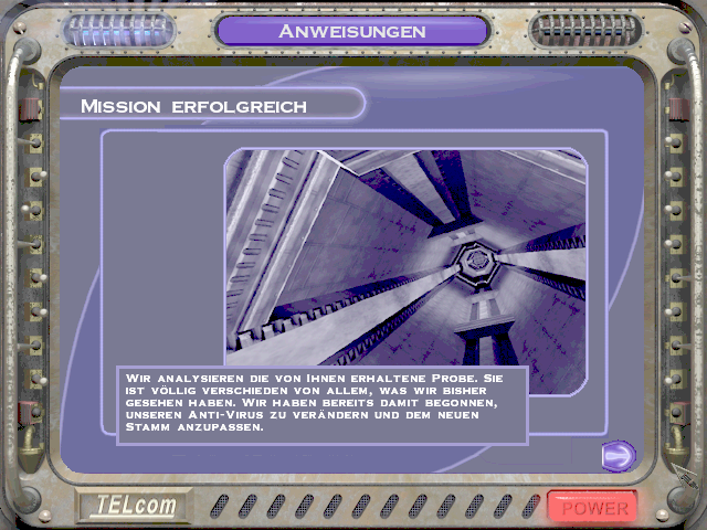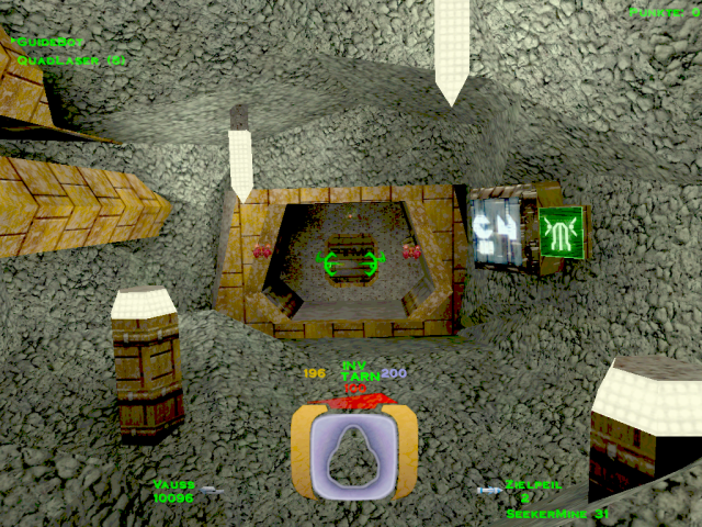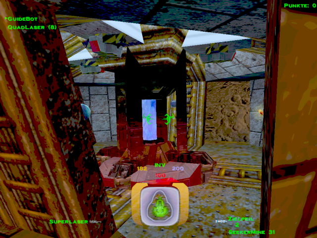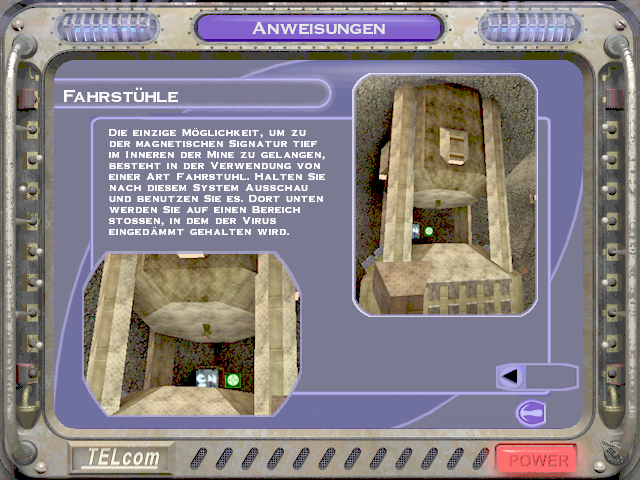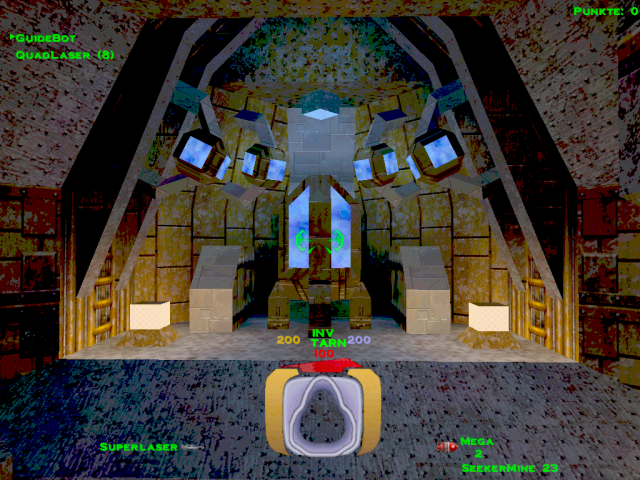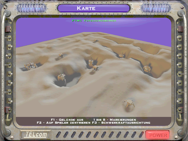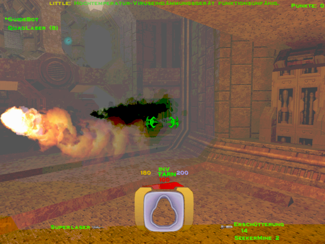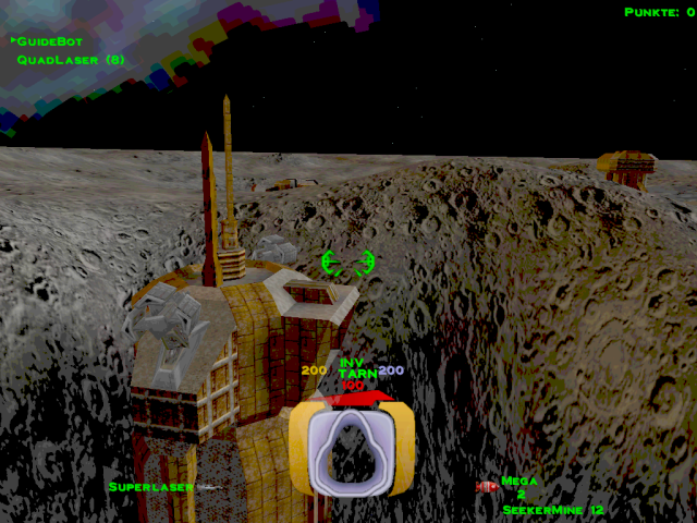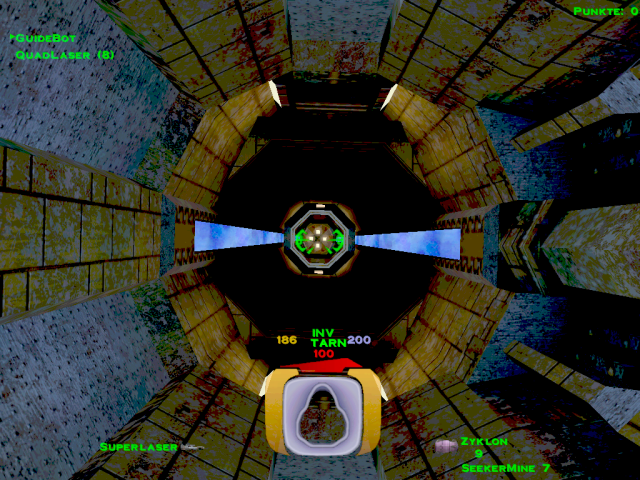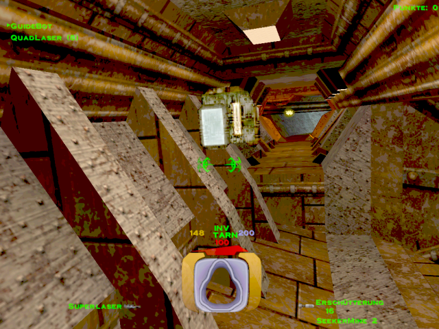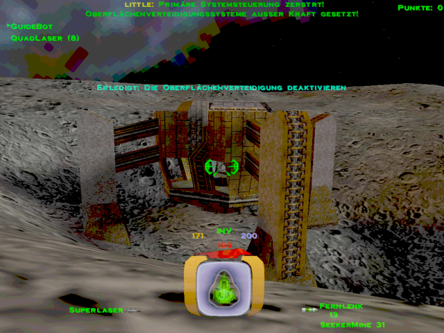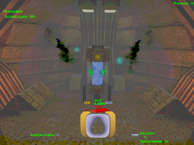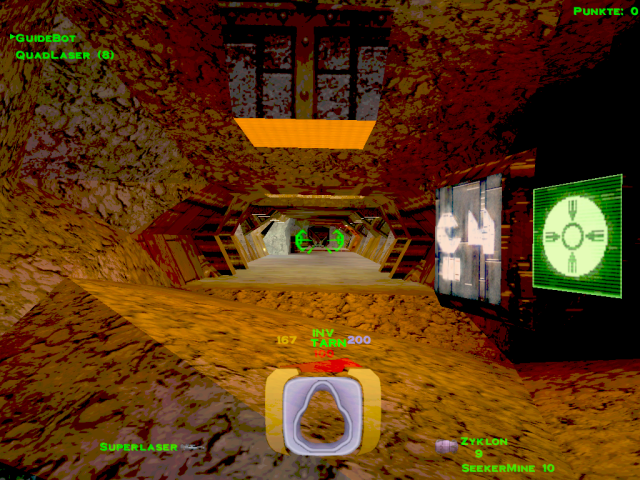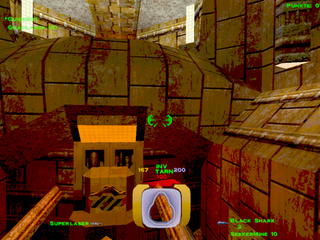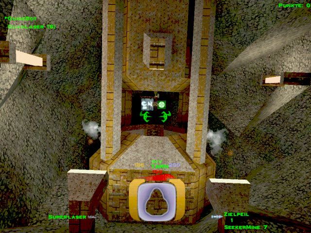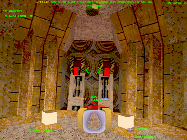 ![]() [ nach oben ] Das Heizsystem versorgt alle Brenner, die die Virusproben vor Zugriffen schützen sollen. Schaltet man das Heizsystem ab, kann man sich ohne Feuerlöscher den Virusproben nähern. Von daher ist es dringend zu empfehlen, das Heizsystem zu zerstören. ![]() [ nach oben ] Die Fahrstühle sind eigentlich nur Transportkanäle, die alle Objekte erfassen und auf die andere Seite ziehen. Diese sind den U-Bahnschienen sehr ähnlich und zeigen durch fließende Leuchtbänder die Sogrichtung an. Langsame Raketen können nicht gegen die Sogrichtung anfliegen und hüpfen immer wieder gegen den Strom bis sie abgedrängt werden. ![]() [ nach oben ] Die Karte zeigt die Oberfläche mit allen Gebäuden. Man startet rechts unten und muss als erstes ganz nach links an allen Geschütztürmen vorbei. Es fliegen vier sehr schnelle Jäger herum und bewachen das Gebiet. Zieht man eine Gerade vom Startpunkt bis zum ersten Ziel, dann liegt der Zugang zum Heizsystem auf dieser Linie. Es ist der nächstgelegene große Geschützturm nach der Deaktivierung der Verteidigungssysteme. Der Zugang dort ist noch durch Kraftfelder blockiert. Diese Kraftfelder sollte man jedoch benutzen, um die beiden fiesen Robots mit den Plasmafäusten dort hinein zu locken. Einfach in den Turm fliegen und rumballern. Sogleich kommen die Deppen angestiefelt und donnern so lange gegen das Kraftfeld, bis ihnen die Schilde ausgehen. Puff und weg. Erst dann zum Turm der Oberflächenverteidigung fliegen. Anbei bemerkt, ist der Levelausgang auf der Oberfläche im Zentrum des Bildes zu sehen. Dieser Turm hat jedoch keinen echten Ausgang und ist mit Panzerglas unzugänglich gemacht. Es wäre also unmöglich, durch diesen Fluchtschacht an die Oberfläche zu kommen. Aber darüber kann man ja mal hinwegsehen. ![]() [ nach oben ] Zuerst geht es zum kleinen Turm mit den vier Schaltern der Oberflächenverteidigung. Alle vier Schalter umlegen und danach auf das blaue Plasma im freigelegten Kern schießen, bis es explodiert. Nur nicht zu dicht dran bleiben, sonst erwischt es einen gleich mit. Danach gleitet man so hoch wie möglich, um sich einen Überblick zu verschaffen. ![]() [ nach oben ] Der Guidebot möchte zwar als zweites Ziel wo anders hin, aber das Heizsystem sollte unbedingt als nächstes deaktiviert werden. Also den Guidebot im Schiff lassen und dort hinfliegen. Der nächstgelegene große Geschützturm ist der Zugang zum Heizsystem, in dessen Schacht man die beiden Deppen hoffentlich schon erledigt hat. ![]() [ nach oben ] Von dort aus sieht man rechts einen kleinen Versorgungsturm mit Powerups und im Hintergrund erkennt man gerade noch das Dach von dem Turm der Oberflächenverteidigung. Das Bild zeigt in die Richtung, aus der man kam. ![]() [ nach oben ] Durch den Schacht nach unten gelangt man zu diesem Zugang, der trotz des Lärms von zwei brandheißen Typen bewacht wird. Durch die Tür geht es weiter zum Heizsystem. ![]() [ nach oben ] Das Kontrollsystem wird schwer bewacht und falls man ein Blackshark besitzt, kann man aus großer Entfernung auf den Boden feuern und so die Robots erledigen. Aber es reicht aus, die vier blauen Würfel oberhalb zu zerstören. Danach den Guidebot aussetzen und zum nächsten Ziel fliegen. ![]() [ nach oben ] Auf dem Weg durch die Höhlengänge immer auf Geheimbereiche achten, die man an den Spalten in den Wänden gut erkennt. Einfach zerstören und hineinfliegen. Dahinter verbergen sind immer Powerups und unter Umständen ist der Weg durch den Geheimbereich sogar kürzer als der normale Weg. ![]() [ nach oben ] Am Ende dieses Ganges steht ein Panzer vor der verschlossenen Zugangstür. Direkt vor ihm ist jedoch noch ein Quergang mit je einem versteckten Stinger. Also am besten nicht gleich hineinfliegen, sondern den Panzer von hier aus bekämpfen. Sollten die Stinger aus ihren Verstecken kommen, kann man im Gang ihren Raketen nicht mehr ausweichen. ![]() [ nach oben ] In den beiden Verstecken rechts und links des Ganges befindet sich je ein Schalter, der die Verriegelung der Tür deaktiviert. Sobald man beide betätigt hat, kann man die Tür öffnen. Doch Vorsicht, auch hier sind zwei Stinger eingeschlossen. ![]() [ nach oben ] Da man das Heizsystem schon abgeschalten hat, kann man ohne Schaden in den Raum hineinfliegen, denn man muss das blaue Plasma mit dem Schiff berühren, um den magnetischen Beschleuniger zu aktivieren. Ist das Heizsystem noch aktiv, wird es hier ungemütlich warm. ![]() [ nach oben ] Der Guidebot eilt gelegentlich etwas zu weit vor und deswegen sollte man ihn rechtzeitig ins Schiff zurück holen. Falls der kleine Helfer durch diesen Schacht verschwindet, könnte er durch den magnetischen Beschleuniger erfasst werden. Es könnte aber auch passieren, dass er irgendwo hier fest hängt und dir nicht folgen kann wenn du durch den Beschleuniger nach unten gerissen wirst. ![]() [ nach oben ] Da ist er, der magnetische Beschleuniger. Er funktioniert wie eine Railgun. Du bist das Projektil und wenn man dort hinein fliegt geht es schnurstracks zum anderen Ende. Ein großes Problem ist die hohe Geschwindigkeit, mit der man am anderen Ende heraus katapultiert wird. Man sieht beim hineinfliegen nicht, was auf der anderen Seite los ist und kommt mit enormer Wucht aus dem Schacht geflogen. Daher gebe ich die ganze Zeit vollen Rückwärtsschub, was später noch sehr wichtig wird. ![]() [ nach oben ] Im tiefsten Punkt der Anlage befindet sich der kraftfeld-gesicherte Bereich mit den Virusproben. Diese Schalter deaktivieren die Kraftfelder, jedoch braucht man dazu einen Sicherheitsschlüssel. ![]() [ nach oben ] Glücklicherweise liegt dieser gleich um die Ecke mitten im Gang. Nach dem Deaktivieren der Kraftfelder und der Vertreibung der Wachposten gelangt man zu den Virusproben. ![]() [ nach oben ] Wenn das Heizsystem noch aktiv ist, steht der ganze Raum in Flammen und man brauch sehr gute Schilde, um das Inferno zu überstehen. Andernfalls stehen nur die beiden Proben in einem Feuerstr