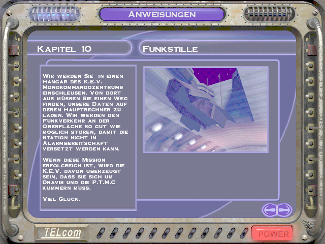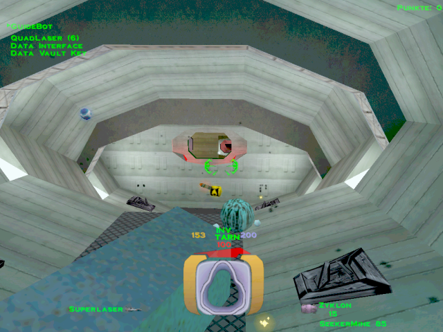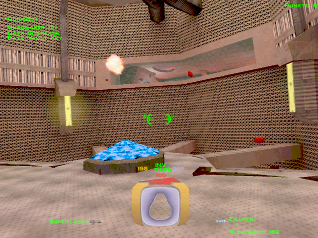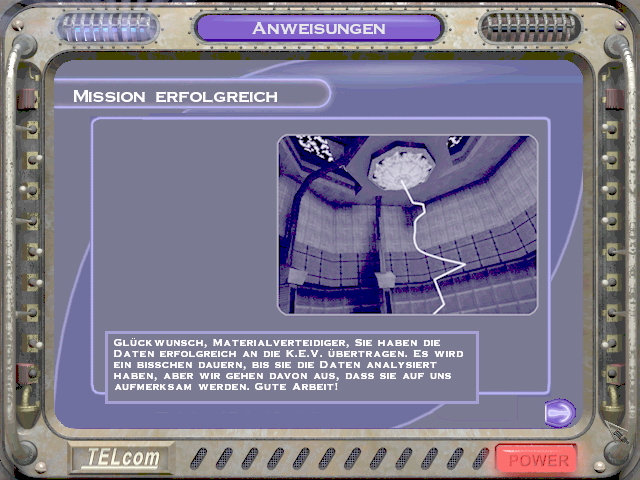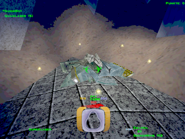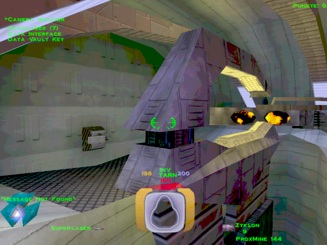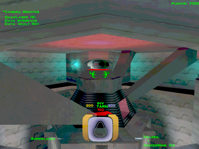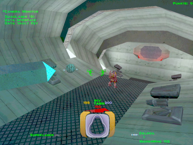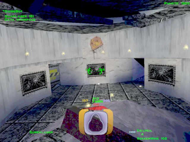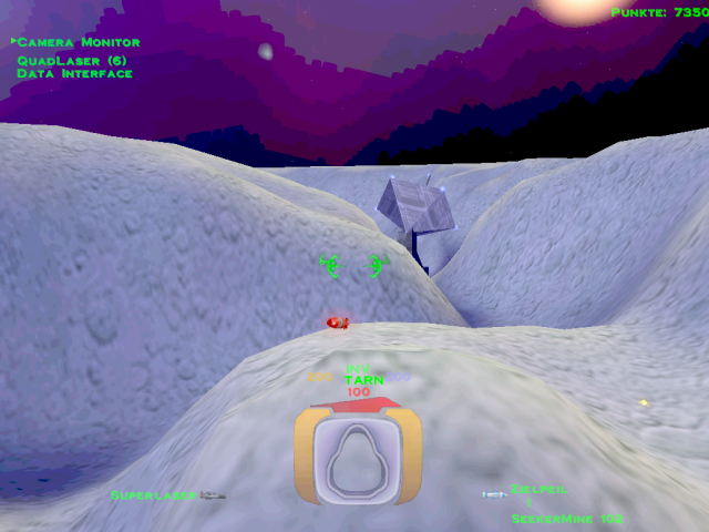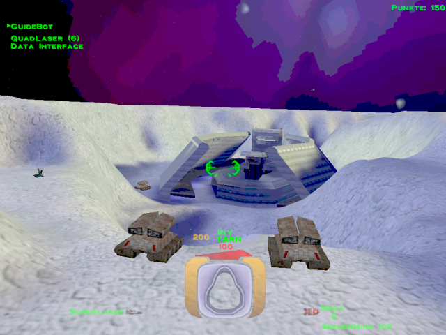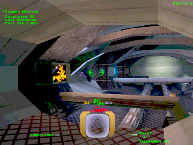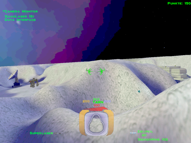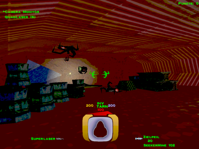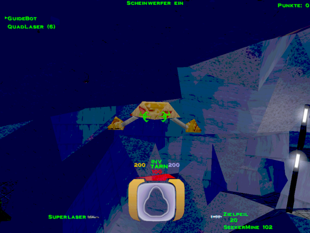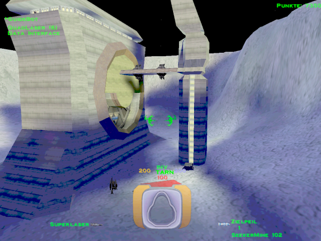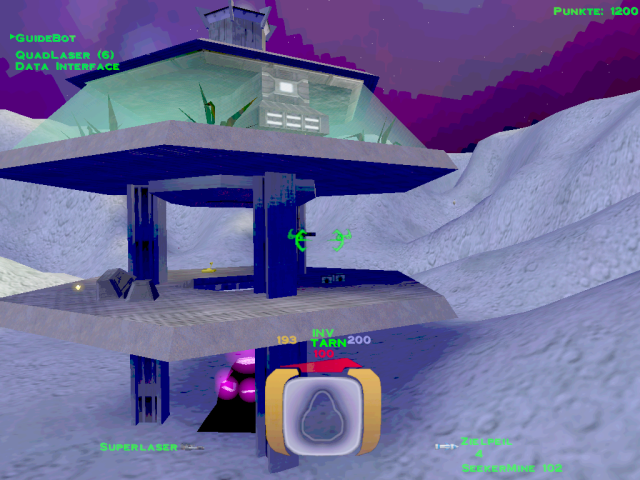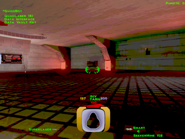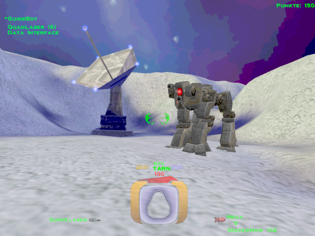![]() [ nach oben ] Im Hangar kommt man noch getarnt aus dem Frachter und verschwindet von der Kamera ungesehen unter einem Landedeck. Dort klinkt man den Guidebot aus und wählt nicht das erste Ziel, sondern die Datenschnittstelle. Diese liegt nämlich bereits auf dem Weg zum Datenraum in einem Schiffswrack. Einen schmalen Schacht hinab geht es durch einen Pest-verseuchten Tunnel. Sehr oft trifft man hier bereits auf den Thiefbot, was nicht so falsch ist, denn hier hat er kaum eine Chance deinem schnellen Dauerfeuer zu entwischen. Doch Vorsicht ist geboten, denn der Hund kann sich auch tarnen. Seine Augen leuchten jedoch weiterhin hell genug und bietet ein gutes Ziel. Lenkraketen nützen jedoch gar nichts. Also mit der Kanone voll drauf halten. Viele der zerstörten Pest-Robots geben ein Schnellfeuer ab, welches man nützlich anwenden kann. Die beiden Stahlplatten am Ende des Tunnels explodieren beim Beschuss und sind mit Vorsicht zu behandeln, oder gezielt einzusetzen, um den Thiefbot eins überzuziehen. ![]() [ nach oben ] In der angrenzenden total zerstörten Halle begegnet man doch tatsächlich einem alten Bekannten, der damals die Sprengung des Reaktors überlebt hat. Dieser Robot aus Descent 1 ist natürlich stinksauer und versucht eine Selbstmordsprengung an deiner Schiffswand. Im Idealfall also möglichst weit entfernt von der Frontscheibe abschießen. ![]() [ nach oben ] In einer Ecke findet man ein Schiffwrack mit einem Logbuch. Da der Guidebot hier die Suche nach der Datenschnittstelle für beendet erklärt, feuert man einfach ein paar Schüsse auf das Wrack und dieses explodiert recht wuchtig. Also nicht gerade drauf sitzen, wenn es hoch geht. Dann die Schnittstelle einsammeln und den Guidebot den Datenraumschlüssel suchen lassen. ![]() [ nach oben ] Die Decke der letzten Halle ist eingestürzt und durch die Öffnung gelangt man an die Oberfläche. Aber Moment mal... das kommt mir so bekannt vor... na klar! Das ist der erste Anblick von Descent überhaupt. Hier begann die erste Mission im ersten Teil. WOW ! Das man das noch einmal zu Gesicht bekommt. Da man damals den Reaktor zerstört hat und dieser bei der Explosion die ganze Anlage vernichtet hat, wundert es auch nicht, dass hier wirklich alles total ruiniert aussieht. Jetzt geht es jedenfalls nicht mehr durch die Tür hinter Dir, sondern durch das Loch in der Decke. Da draußen jedoch ein Robot nach dir Ausschau hält, empfielt es sich, die Tarnung erst zu verwenden, wenn man bereit für den Ausstieg an die Oberfläche ist. ![]() [ nach oben ] An der Oberfläche angekommen, hat man gleich zwei Probleme mit Wachrobots, wenn man nicht getarnt ist. Die beiden sollten möglichst schnell zum schweigen gebracht werden, weil sie sonst die ganze Mannschaft alarmieren. Es gibt insgesamt sechs größere Täler. Auf der linken Seite in der Mitte ist die Landebucht mit Kraftfeld zu sehen und unmittelbar links daneben ist die eingestürzte Decke, durch die man an die Oberfläche gekommen ist. Das Tal links unten ist voller Powerups und sollte unbedingt aufgesucht werden, bevor man sich auf den weiteren Weg macht. Der Guidebot möchte in das Tal weiter oben und von dort aus auf die rechte Seite bis zum Datenraum ganz rechts unten. Hier fliegen einige schnelle Jäger hoch am Himmel oder fern am Horizont. Sofern der Alarm nicht ausgelöst wurde, oder man aus Versehen einen Jäger beschießt, bleiben die Teile friedlich. Man sollte sie jedoch immer im Auge behalten. ![]() [ nach oben ] Nachdem man die Powerups eingesammelt hat und dem drängelndem Guidbot endlich folgt, sieht man im angrenzendem Tal dieses seltsame Gewächshaus. Auch hier ist ein Wachrobot, der sofort die Flucht ergreift um Alarm zu geben. Sofort hinterher und vernichten, sonst bekommt man zu viel Besuch. An der Basis des Gewächshaus ist ein Matcen, welches unerlässlich Powerups produziert. Man kann sich also kräftig eindecken. Sobald man ein Powerup aufgenommen hat, bildet sich ein neues, jedoch sollte man dieses erst einmal liegen lassen und statt dessen ganz nach oben gleiten bis man in einen geheimen Raum hineinfliegt, in dem man Megaraketen und Blackshark vorfindet. Die wird man schneller brauchen, als man denkt. Weiter durch die nächste Schlucht, aber die Raketen gut verstauen, denn in der Schlucht sind kleine Panzer, die man nicht mit so etwas Gewaltigem vaporisieren sollte. ![]() [ nach oben ] Man sollte sich möglichst leise bewegen bis man über einem Bergpass diesen Weitblick genießen kann. Rechts ist eine gewaltige Verteidigungsanlage mit Planetargeschütz, Panzern, Raketenwerfern und einer ganzen Sammlung kleiner Maschinengewehre. Sehr ungemütlich dort spazieren zu wollen. Dann lieber dem Juggernaut aus großer Distanz ein oder zwei Megaraketen an den Hals knallen und an der rotierenden Schüssel vorbei bis zur Vorderansicht des Planetargeschütz schleichen. ![]() [ nach oben ] So nah sollte man dem Juggernaut nicht kommen, wenn man ohne Tarnung unterwegs ist. Falls man jedoch die Cheats verwendet, kann man sich zwischen die Zelte setzen und einen kleinen Schuss abgeben. Der Juggernaut kommt dann freundlich auf dich zu gelaufen und möchte das du das Stöckchen wirfst. Beeindruckende Kampfmaschine, aber im Anfängermodus reichen zwei Megaraketen und das gute Stück bricht zusammen. Weiter geht es geradeaus durch das Tal. Dort liegen ein paar Powerups. ![]() [ nach oben ] Zurück blickend sieht man die rotierende Schüssel und hier kann man alles einsammeln, außer dieser Megarakete. Die ist mit einem Alarmsensor verbunden, der dir sofort ein paar aufdringliche Vertreter einer anderen Spezies auf den Hals schickt, die dir keine Staubsauger verkaufen wollen. ![]() [ nach oben ] Auf leisen Sohlen geht es weiter bis man die Kampfpanzer erblicken kann, dann eine harte Kurve nach links durch ein schmales Tal. Immer den Kopf unten lassen bis man im Nachbartal angekommen ist. Falls man auf Krawall gebürstet ist, kann man sich auch mitten ins Getümmel stürz