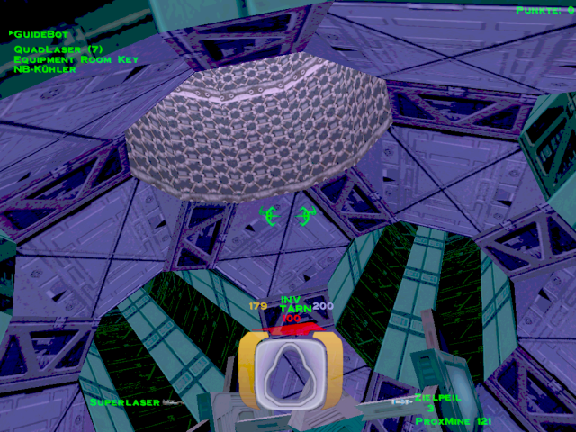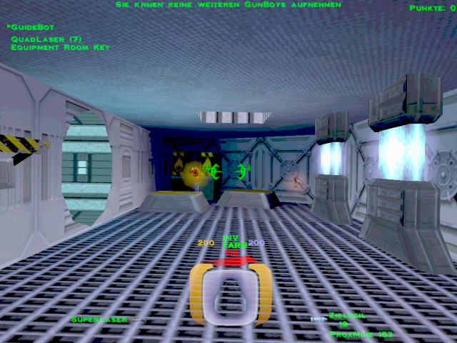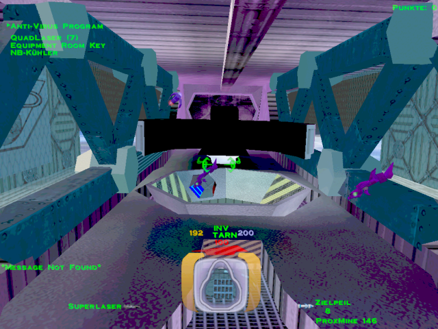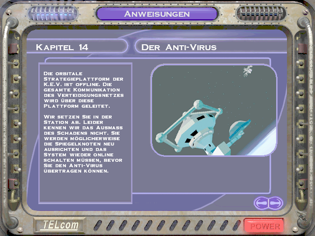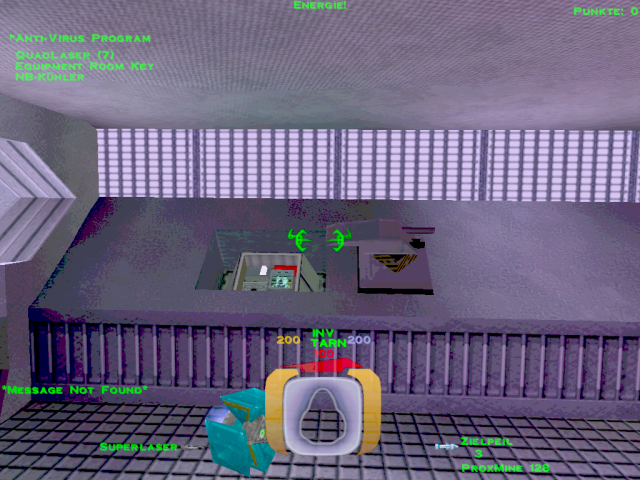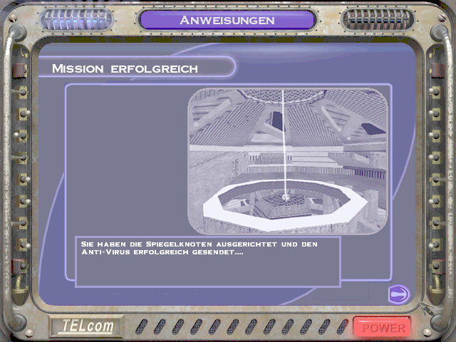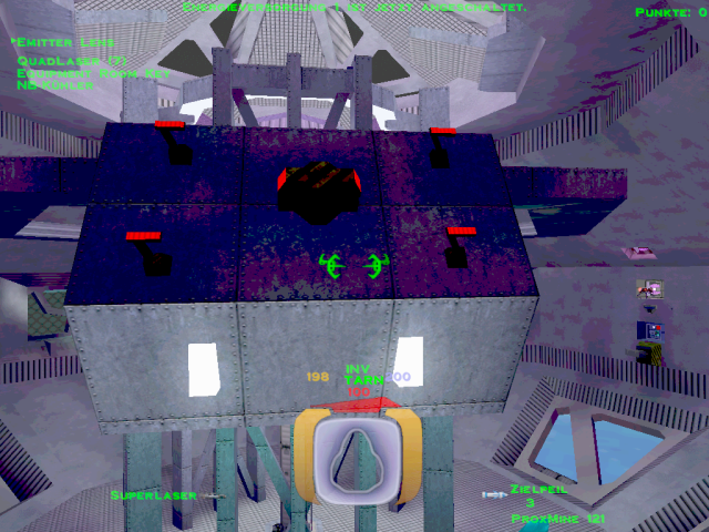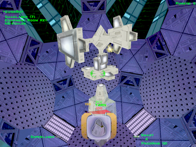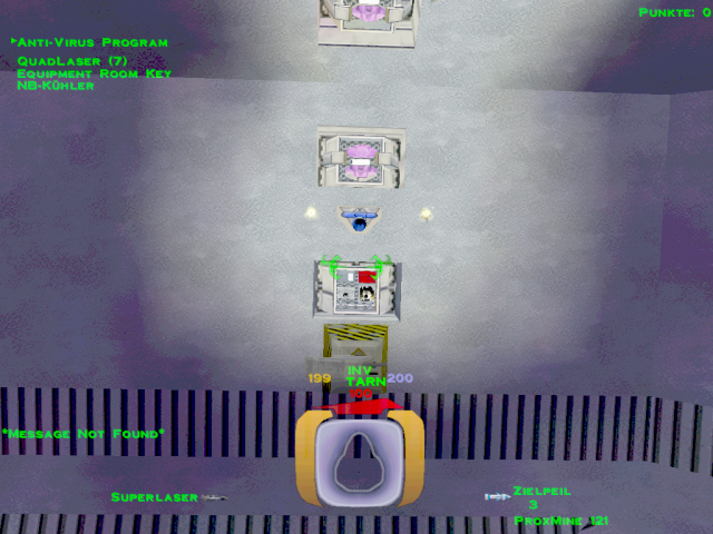 ![]() [ nach oben ] Die Station ist nicht besonders groß, aber die kleinen schlangenähnlichen Robots sind extrem lästig und schwer zu zerstören. Die ersten beiden Ziele liegen auf dem selben Weg und man kann die Suche nach dem Schlüssel zum Ausrüstungsraum übergehen und statt dessen gleich zum Shuttle-Auskoppelungsschalter fliegen. Der Schlüssel liegt auf einer Liege neben einem Opfer. ![]() [ nach oben ] Der Auskoppelungsschalter befindet sich hinter dem Rettungsshuttle. Ein Schuss und die Crew ist gerettet. Oder ganz leise zum Schalter schleichen und diesen mit der Schiffsnase sanft antippen und auf Samtpfötchen davon schleichen. Statt nun dem Guidebot das nächste Ziel suchen zu lassen, kürzt man den Weg ab und holt selbst den nächstgelegenen Überbrückungsstecker. Der Guidebot möchte zuerst alle Überbrückungsstecker finden und danach die infizierten Links reparieren. Diese Reihenfolge ist viel zu umständlich und führt immer wieder in die selben Räume. Sobald man einen Überbrückungsstecker hat, kann man diesen sofort verwenden. Also statt ganz hoch ins Arboretum zu fliegen und dort den Stecker zu holen, fliegt man um die Andockklammer herum und dort in den Schacht. ![]() [ nach oben ] Direkt unter der Shuttleandockbucht ist der Schacht frei geworden, den man nun abwärts fliegt. In der angrenzenden dreieckigen Ebene sind nicht nur die lästigen Schlangen, sondern auch einige Söldner. ![]() [ nach oben ] Über dem Eingang befindet sich ein Überbrückungsstecker und von diesem Raum aus geht rechts und links jeweils ein Gang ab, die in ähnliche Räume führen. ![]() [ nach oben ] In einem der beiden angrenzenden Räume liegen Logbücher, die man einsammeln und lesen kann. In einem der beiden steht der Deaktivierungscode für den Schutzschild in verschlüsselter Form NW-SE-W-NE was nichts anderes bedeutet als Nordwest - Südost - West - Nordost, folglich Linksoben - rechtsunten - links - rechtsoben. Die Reihenfolge wird später benötigt. ![]() [ nach oben ] Im anderen Raum ist ein infizierter Datenlink den man durch Berühren repariert. Dabei wird der Überbrückungsstecker verwendet, den man im Eingangsbereich gefunden hat. Danach folgt man dem Guidebot zum nächsten Überbrückungsstecker. ![]() [ nach oben ] Der Überbrückungsstecker befindet sich hinter den Napalmfässern, die man durch Beschuss zur Explosion bringt. Im selben Raum befinden sich auf der anderen Seite drei Schalter für die Energieversorgung. Die Energie wird auch für die Matcen verwendet und sollte so schnell wie möglich abgeschalten werden. Auf der anderen Seite der Kreuzung ist ein Matcen und eine Tür. ![]() [ nach oben ] Durch die Tür links um die Ecke, findet man eine Ersatzlinse, die man unter Umständen noch benötigt. Die Linse muss man zwar nicht mitnehmen, aber wenn man sie benötigt, sollte es schnell gehen. Da man bereits im Besitz eines Überbrückungssteckers ist, kann man gleich den nächsten Datenlink reparieren. Dazu fliegt man weiter nach oben in die riesige Übertragungshalle. ![]() [ nach oben ] An der Wand befinden sich von oben nach unten zwei Matcen, der getarnte Übertragungsschalter, die Antivirusschnittstelle und ganz unten ein infizierter Datenlink. Diesen repariert man mit dem zweiten Überbrückungsstecker und wendet sich dann nach rechts zu einer riesigen Schalttafel über dem Zugang im Boden. ![]() [ nach oben ] Hier wird der verschlüsselte Code verwendet. Die kleinen Schalter in der Reihenfolge links oben, rechts unten, links unten, rechts oben und danach den Hauptschalter betätigen. Das muss sehr schnell gehen, da beim Aktivieren des ersten Schalters ein Countdown startet. Der Hauptschalter deaktiviert das Kraftfeld der Übertragungsknoten im Senderkern. Im Zentrum der Halle ist eine Übertragungslinse und der Zugang zu den Knoten. ![]() [ nach oben ] Die Übertragungsknoten sind sehr empfindlich und drehen sich bei kleinster Berührung. Da die Röhren mit Robots verseucht sind, ist es schwierig die Knoten ausgerichtet zu lassen. Der Übertragungsknoten ist richtig ausgerichtet, wenn sich an der Basis des T-Knotens ein blauer Plasmabogen bildet. Dann fliegt man nacheinander alle Knoten an und richtet sie aus. Dabei sollte man alle Robots in den Verbindungsröhren zerstören, um die Robots daran zu hindern, die Knoten wieder zu verdrehen. Der Guidebot ist keine Hilfe, sondern eher ein Störenfried. Er feuert permanent Leuchtfackeln und verdreht dabei bereits ausgerichtete Knoten. Der Kamerad sollte also im Schiff bleiben. ![]() [ nach oben ] Wenn die Meldung kommt, dass man alle Knoten ausgerichtet hat, sucht man den Ausgang zur Linse. Dieser Ausgang ist durch eine andere Textur an der Tunnelwand zu erkennen. Beim Flug vorbei an den ausgerichteten Knoten, sollte man auf seinen Hintern aufpassen, dass dieser nicht die Knoten berührt und sie wieder verdreht. Sobald man die Linse erreicht hat, klingt man den Guidebot aus und sucht den letzten Überbrückungsstecker. ![]() [ nach oben ] Der Weg führt ins Arboretum. Auf einer kleinen Insel liegt der Überbrückungsstecker und dieser wird eine Etage tiefer zur Reparatur eines Datenlinks verwendet. ![]() [ nach oben ] Direkt unter dem Arboretum ist ein Raum mit Matcen, einem Datenlink und einer Übertragungsschnittstelle. Die Datenschnittstelle wird berührt und der letzte Überbrückungsstecker wird verwendet. Das Übertragungssystem startet und man kann den Antivirus einspielen. Gleich daneben befindet sich eine Übertragungsschnittstelle. Man setzt sich direkt davor und aktiviert die Übertragung des Antivirus. Auf dem Display erscheint nun der Anwahlcode O, der im Technikraum eingestellt werden muss. Man klinkt den Guidebot aus und fliegt zum Technikraum. ![]() [ nach oben ] Dort befindet sich in der Basis ein Schwenkarm, der sich durch Berühren drehen lässt. Diesen Arm dreht man auf das O-Symbol und betätigt danach den Schalter direkt über der Position des Armes. ![]() [ nach oben ] Da man nun alle Vorb